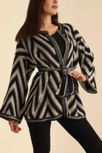 Zikzak Desen Kuşaklı Hırka - Siyah & BeyazZikzak Desen Kuşaklı Hırka – Siyah & Beyaz